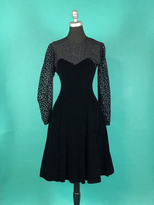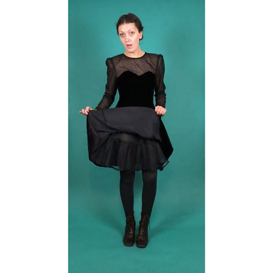 Black Velvet Tutu Tulle Dress Vintage 80s Sheer Polka Dot Long Sleeve Sweetheart Niki Originals Fit and Flare size 4