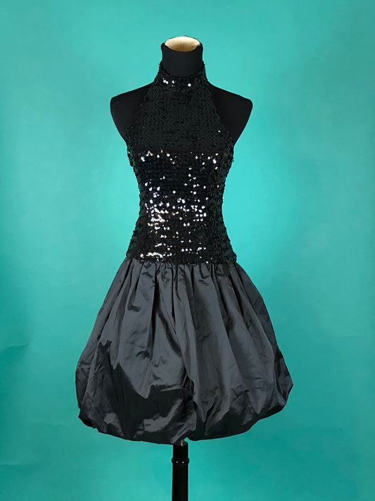 Black Sequins Halter Dress 80s Vintage Party Drop Waist Tulle Bubble Skirt Cocktail Formal Gown size 3
