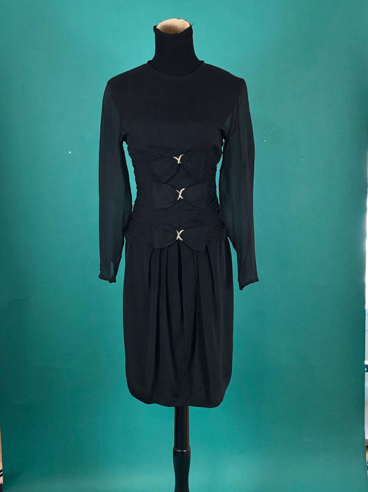 Black Sheer Bow Dress Vintage 90s Body con Ruched Waist Long Sleeve Cocktail Formal Evening Silk LBD size 6