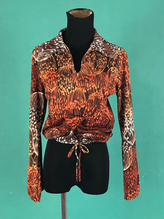 Abstract Bell Long Sleeve Vintage 70s Drawstring Wingtip Collared Disco Boho Blouse Top size Small