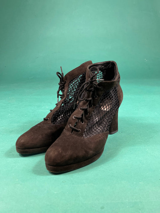 Black Platform Shoes Mesh Suede Bis Charles Jourdan Vintage 90s Netted Chunk Heel Lace Up Black Ankle Heel size 8.5
