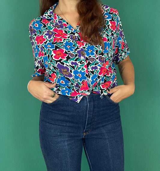 Bright Floral Vintage 90s Button Up Pocket Blouse size L