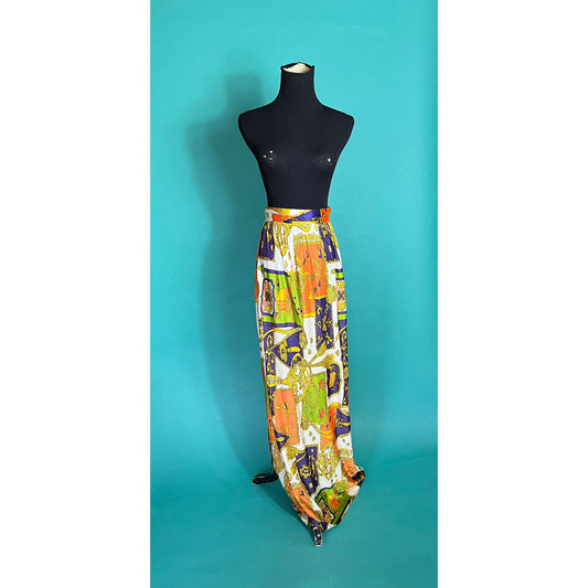 70s Vintage Bright Crest Print High Waisted Graphic Maxi Skirt size Small