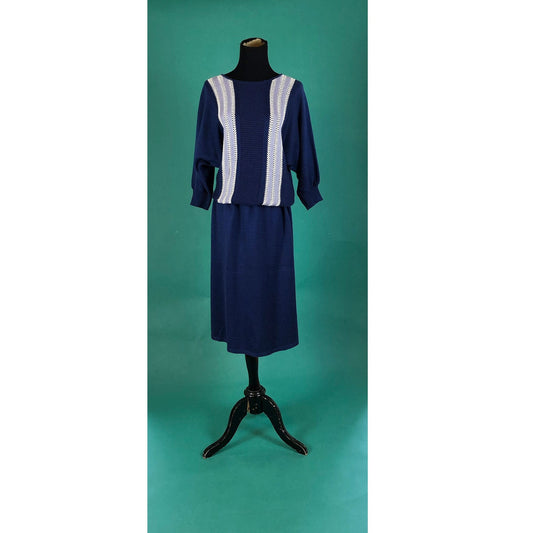 Blue and White Striped Knit Vintage 70s Batwing Short Sleeve Knit Piroli Two Piece Skirt Set size 12