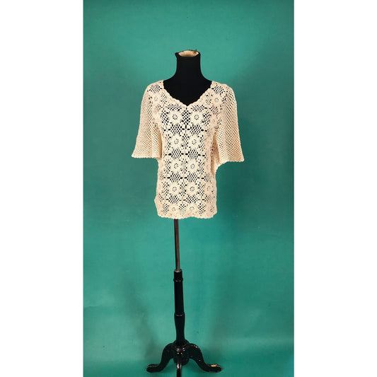 Beige Floral Crochet Batwing Vintage 70s Crew Neck Butterfly Sleeve Fitted Summer Festival Beach Top size Small