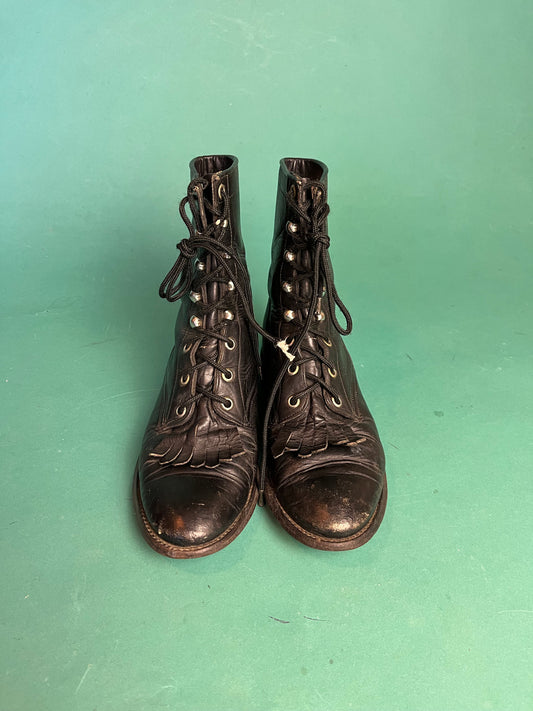 Black Leather Distressed Boots Vintage 80s Fringe Cowtown Lace Up Biker size 5D
