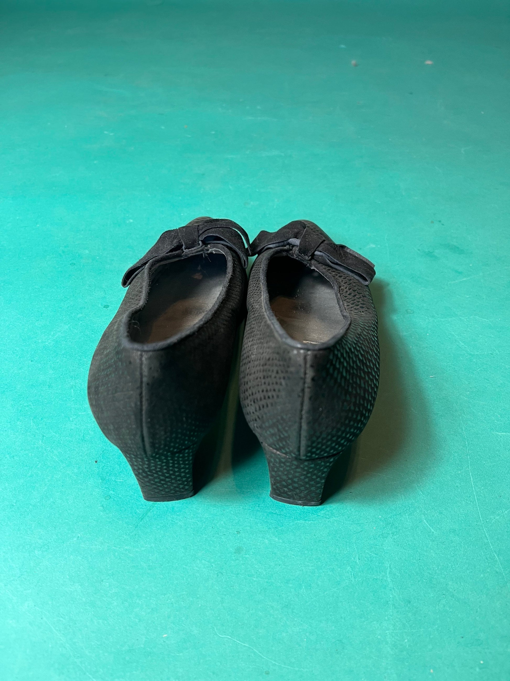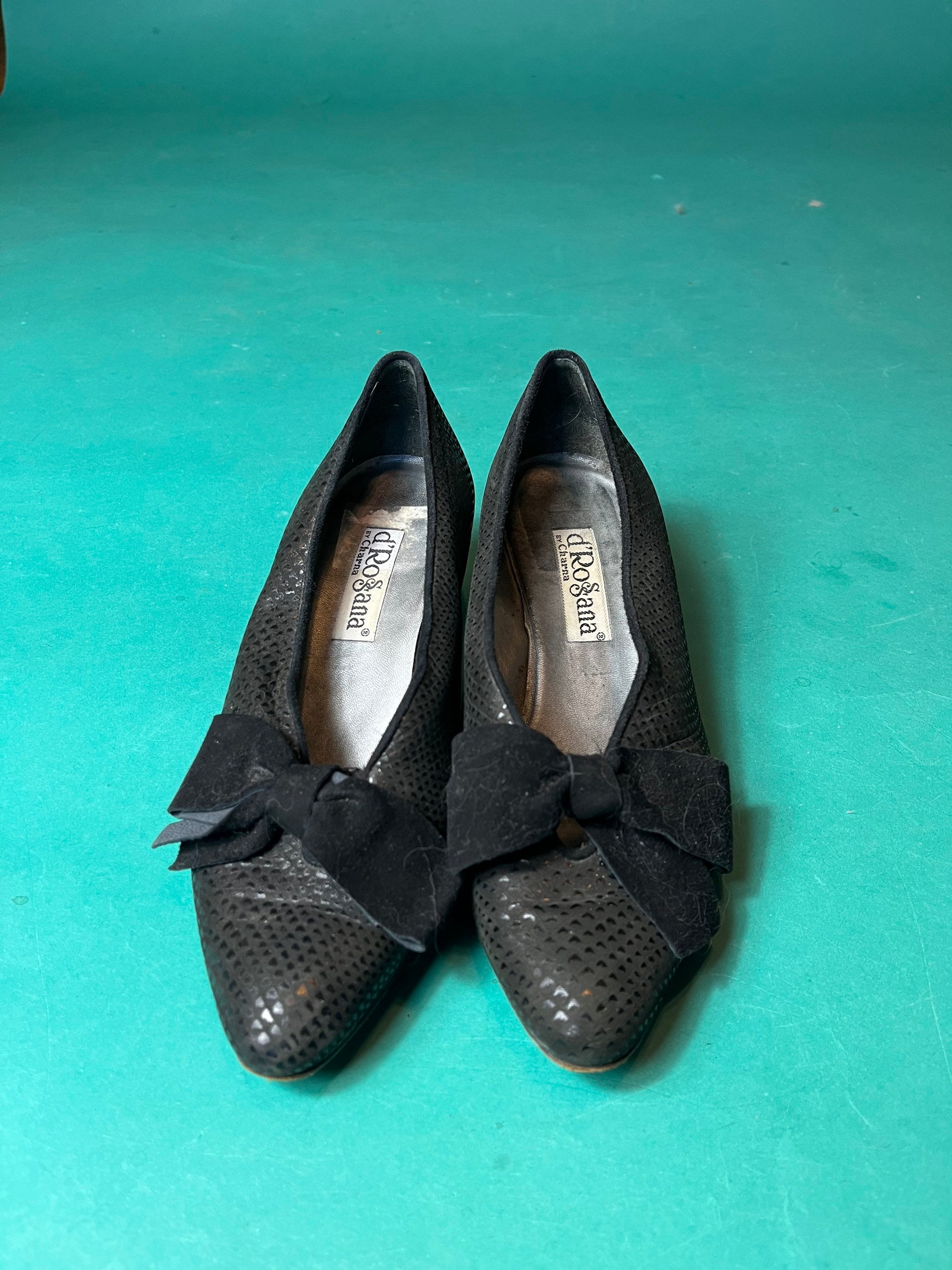 Black BIG BOW Loafers Velvet Vintage 70s D'Rossana by Charna Velour Block Chunky Heel Key Hole size 7.5M