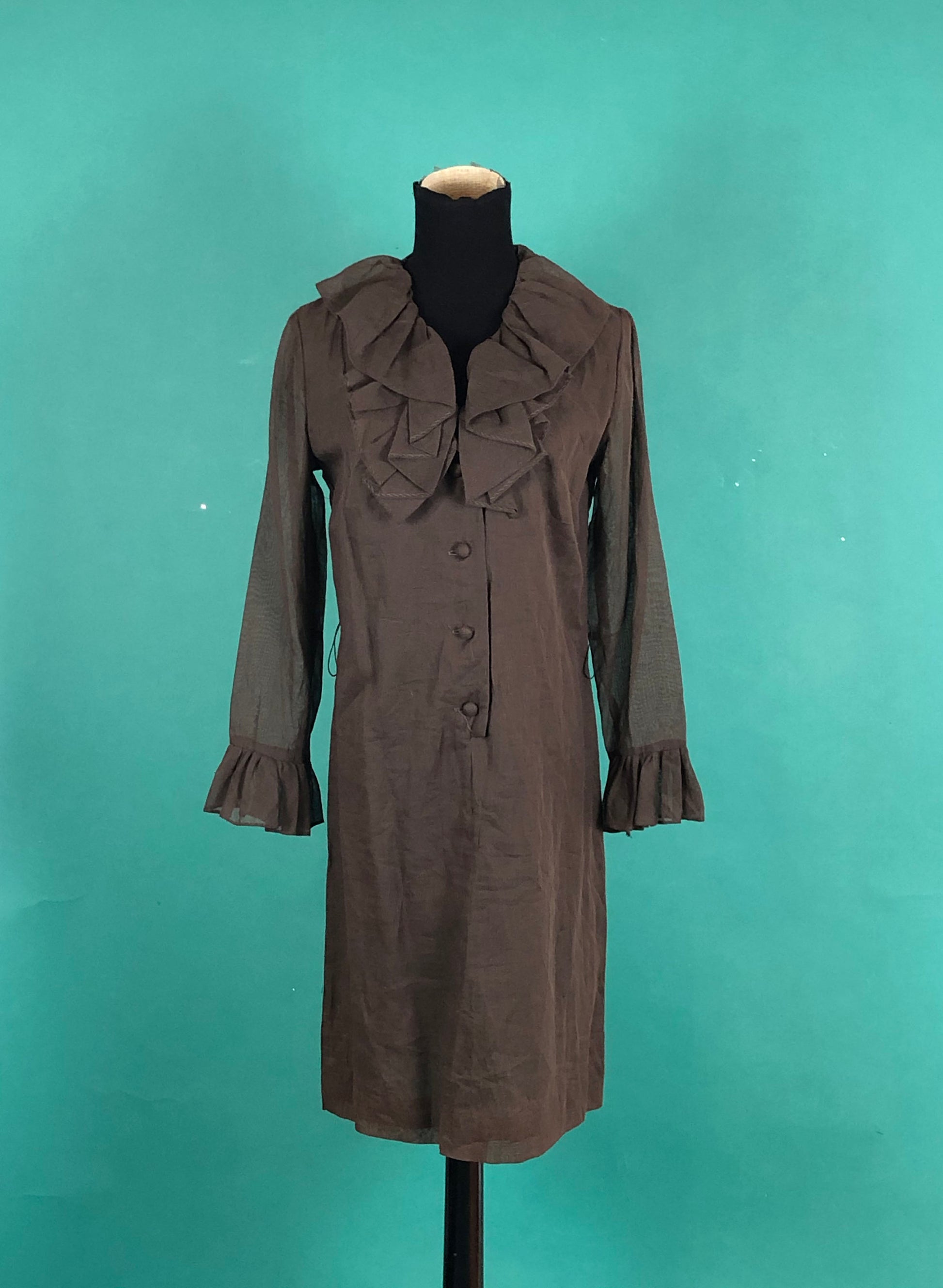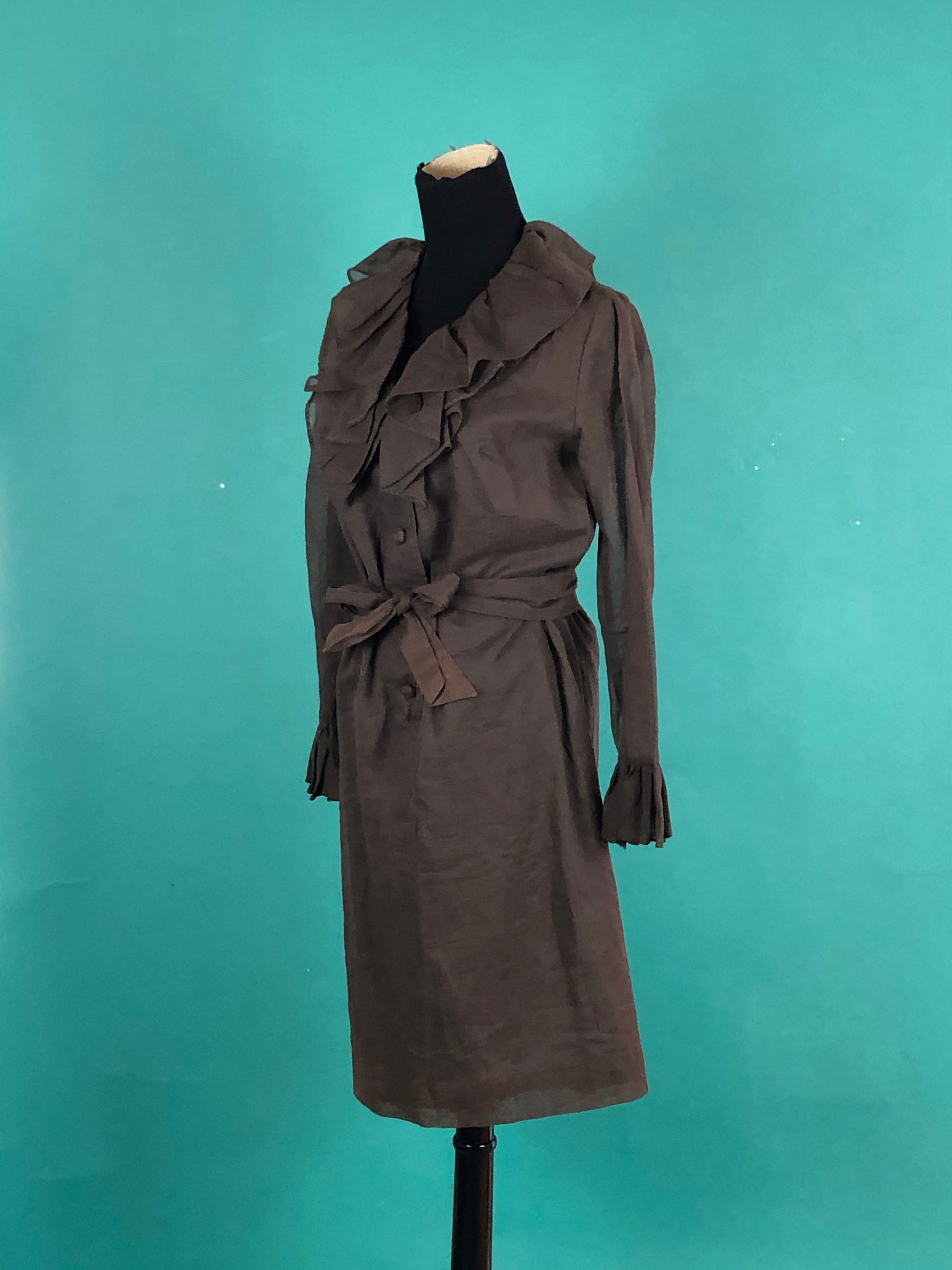 Brown Ruffled Collar Tuxedo Dress Vintage 70s Long Sheer Sleeve Belted Waist Knee Length Button Up Shift Dress size 12