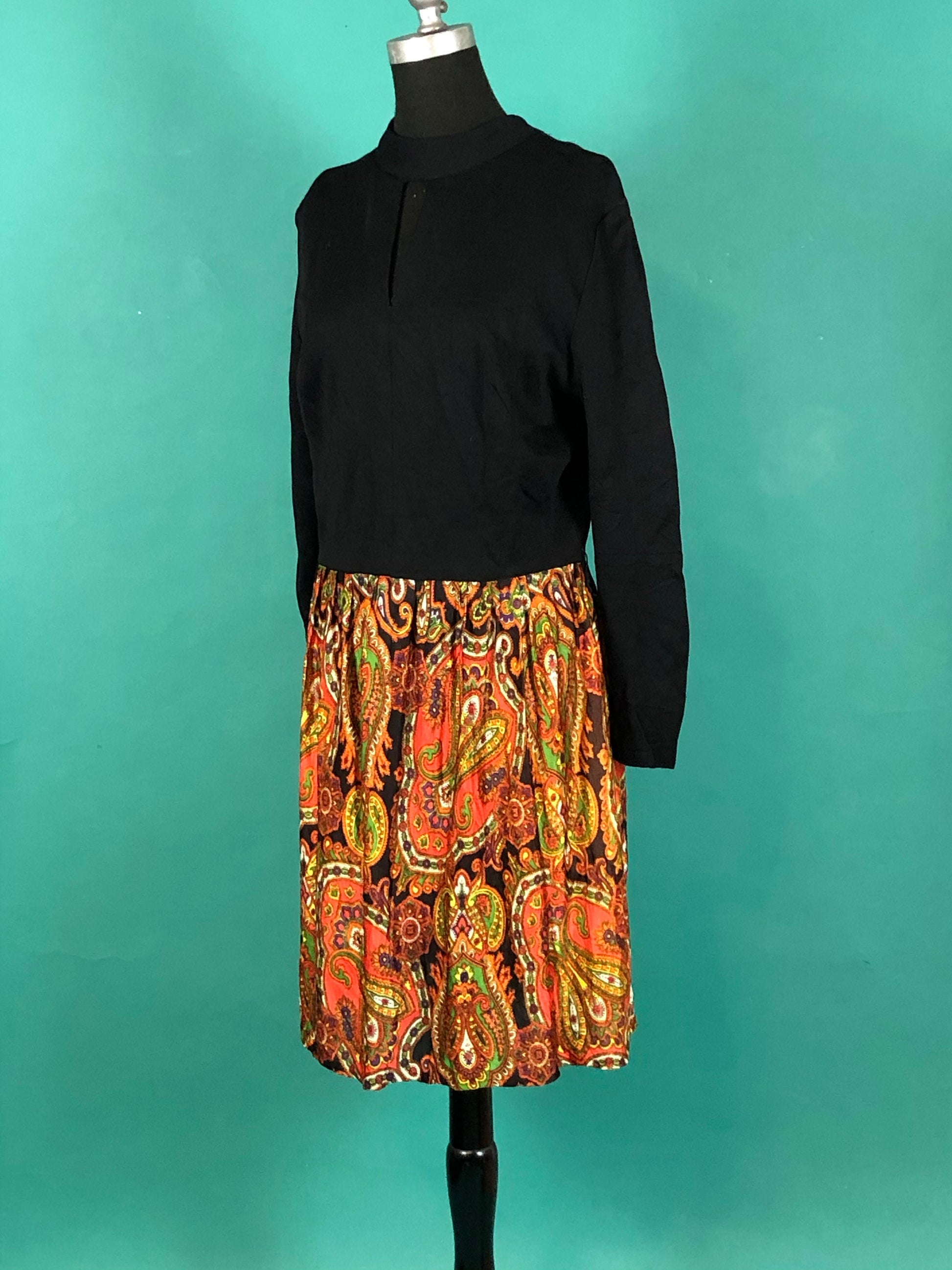 Keyhole Paisley Dress Vintage 70s Long Sleeve Mock Neck Retro Hippie Boho size 14