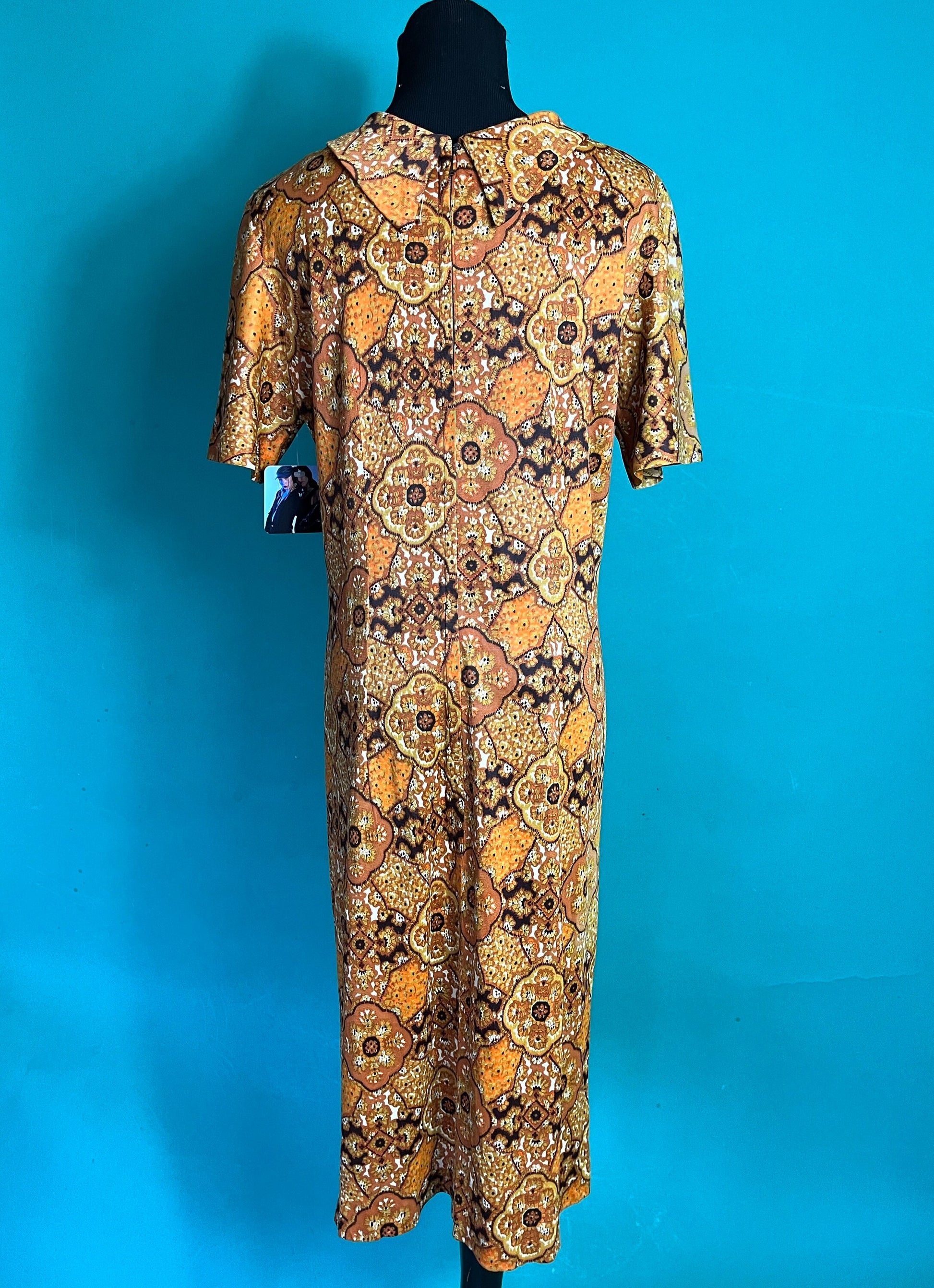 Medium Vintage Paisley Psychedelic Rust and Orange Tie Collar Shift Midi Mod 60s Dress
