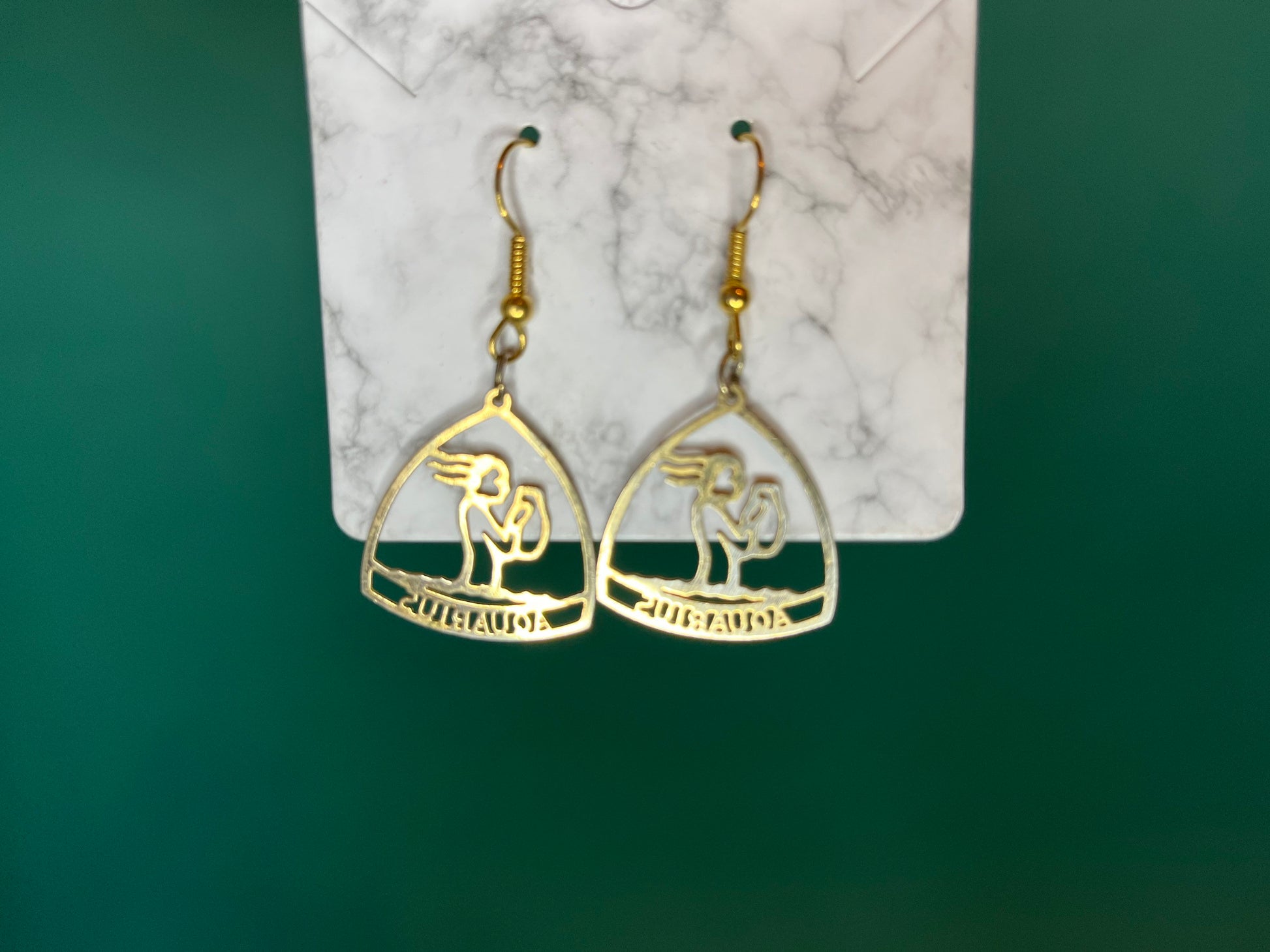 Metal Gold 70s Vintage Zodiac Aquarius Dangle Hook Earrings