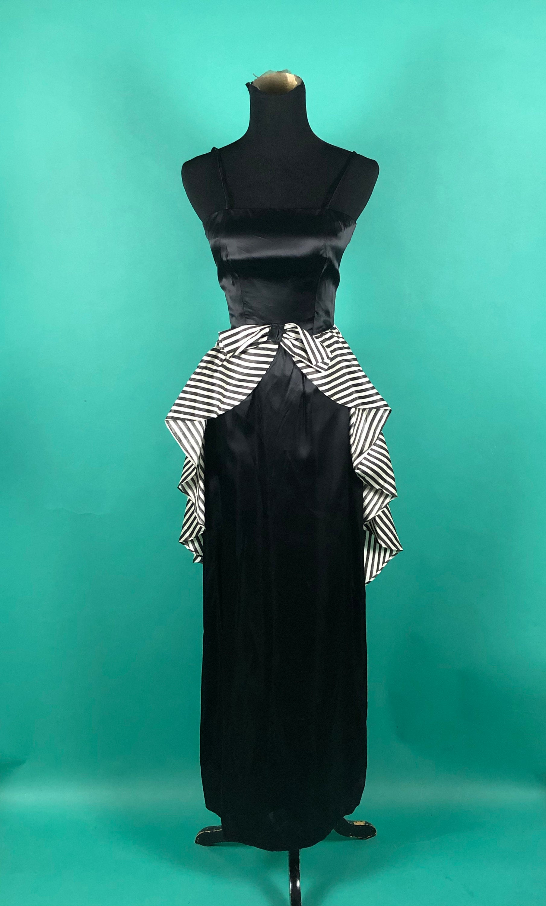 Vintage 1960s 60s Breakfast At Tiffanys Square Neck Spaghetti Strap Pencil Slitted Black Dress with Striped Bow Overskirt size XXS/ XS