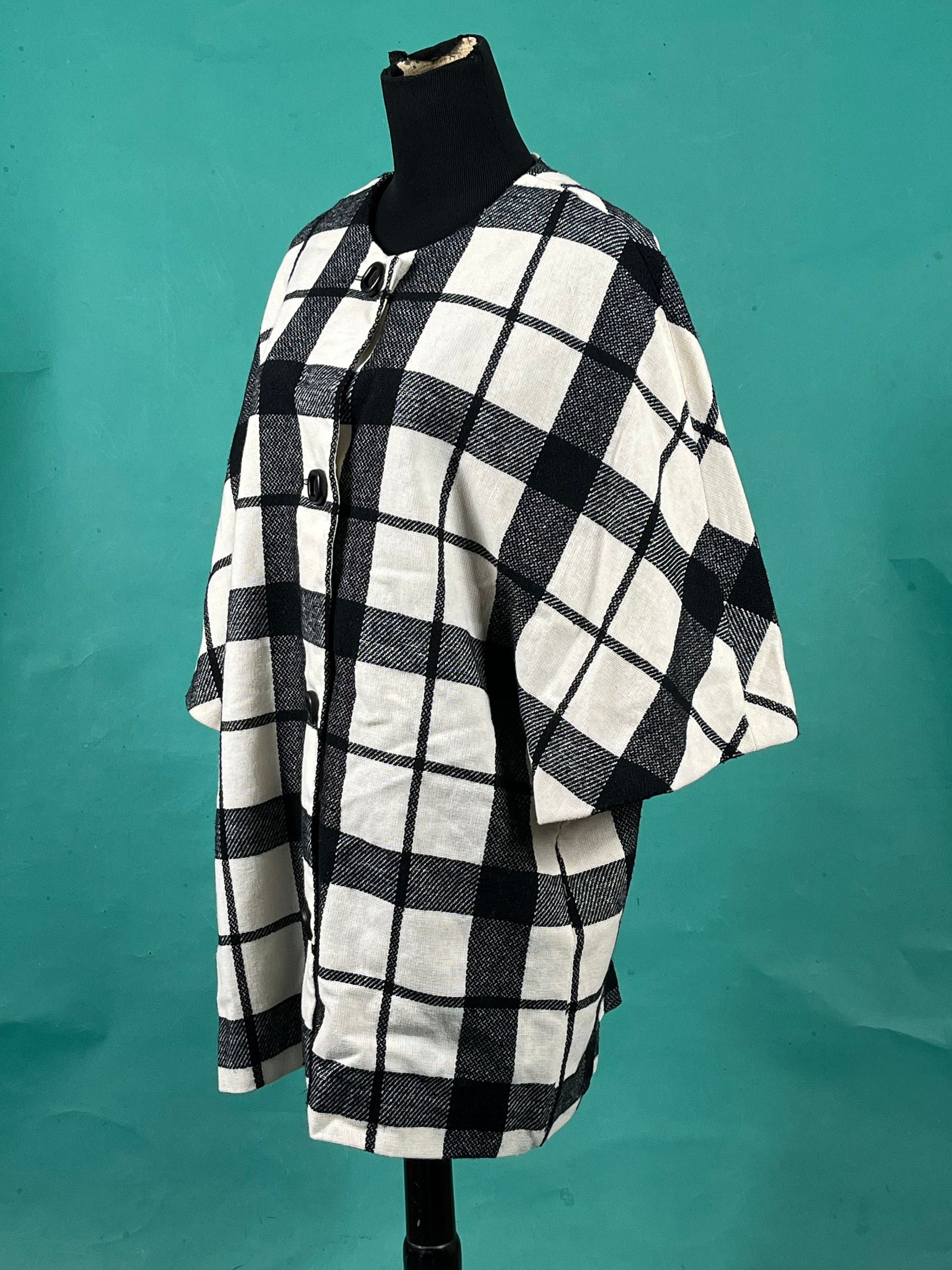 Vintage 50s Big Plaid Black and White Batwing Button Up Mister Roberts Poncho Coat size Medium