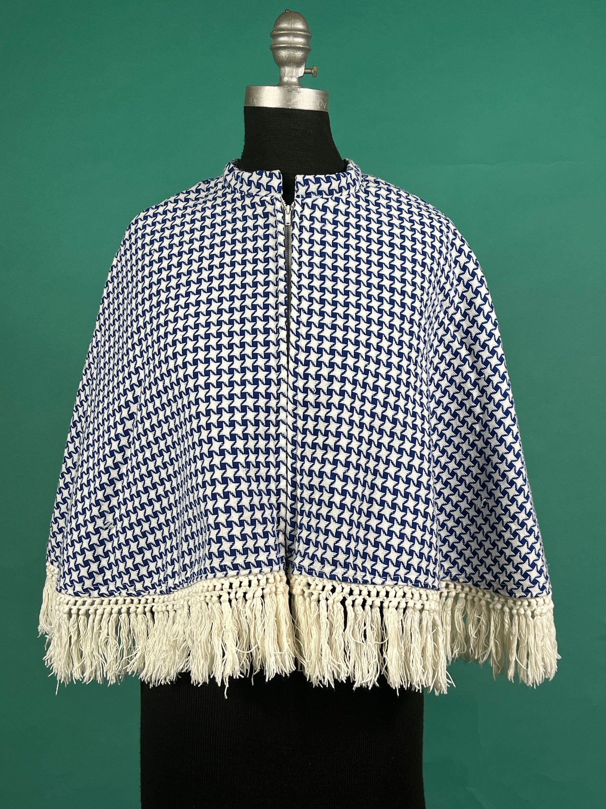 Vintage 70s Blue and White Houndstooth Tasseled Zip Up Quilted Lined Winter Poncho Cape