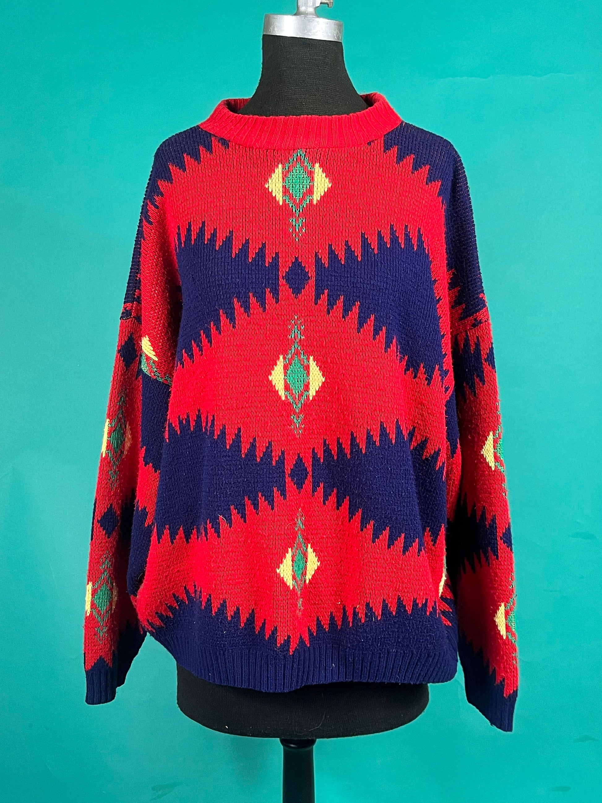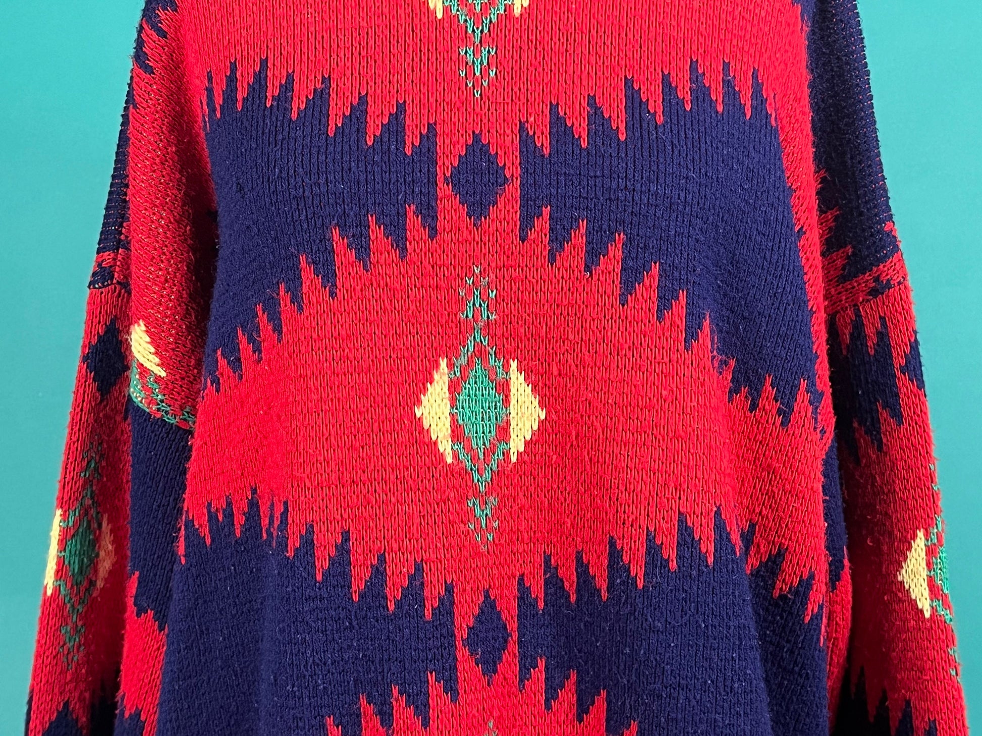 Vintage 70s Southwestern Long Sleeve Bright Knit Crew Neck Pullover Sweater size Large