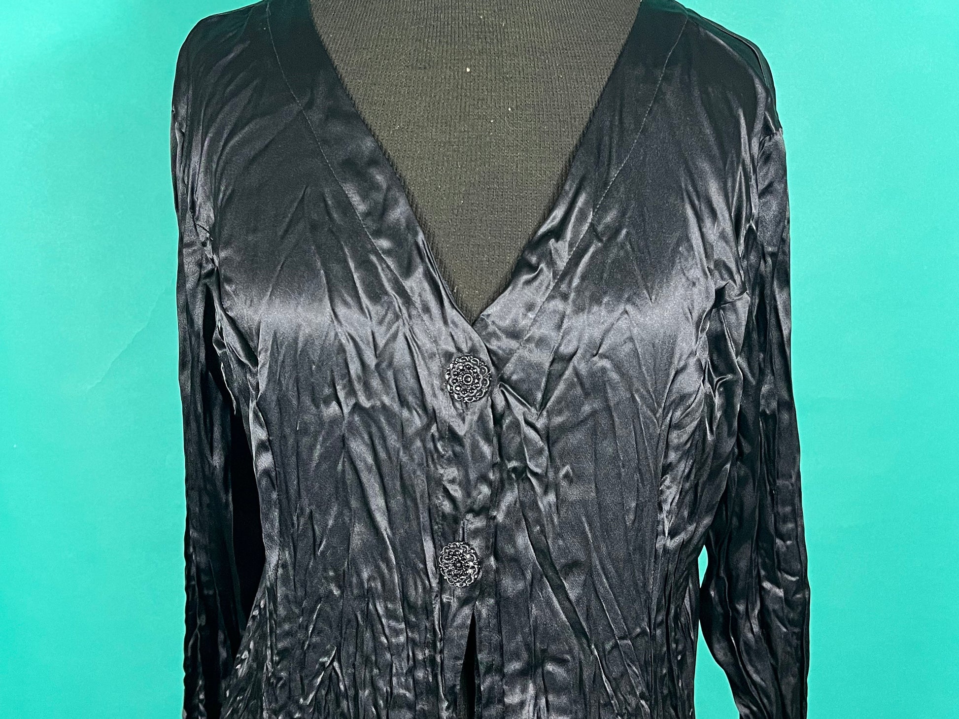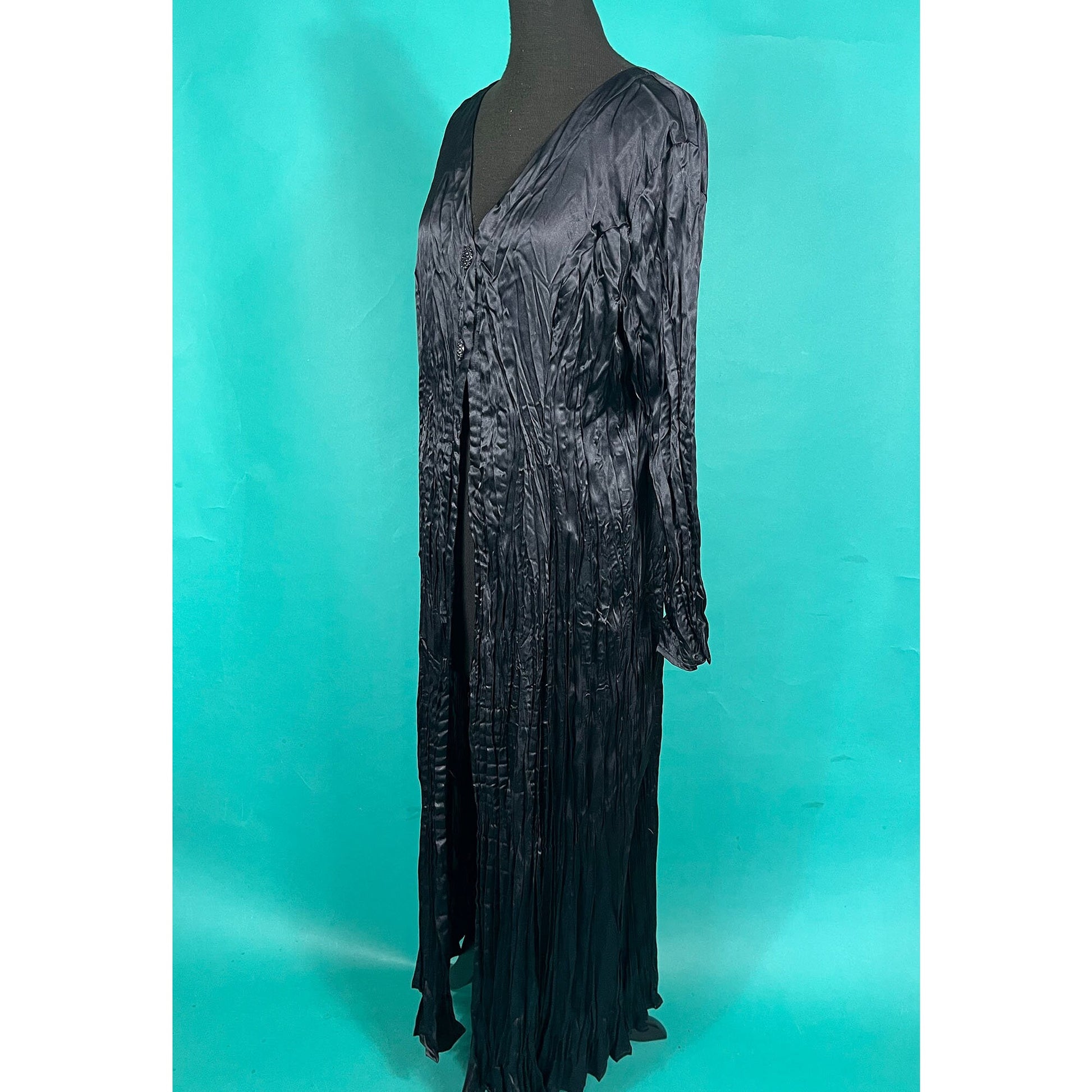 Vintage 90s Black Silk Long Crinkle Goth Witchy Button Up Long Sleeve Pullover Light Coat