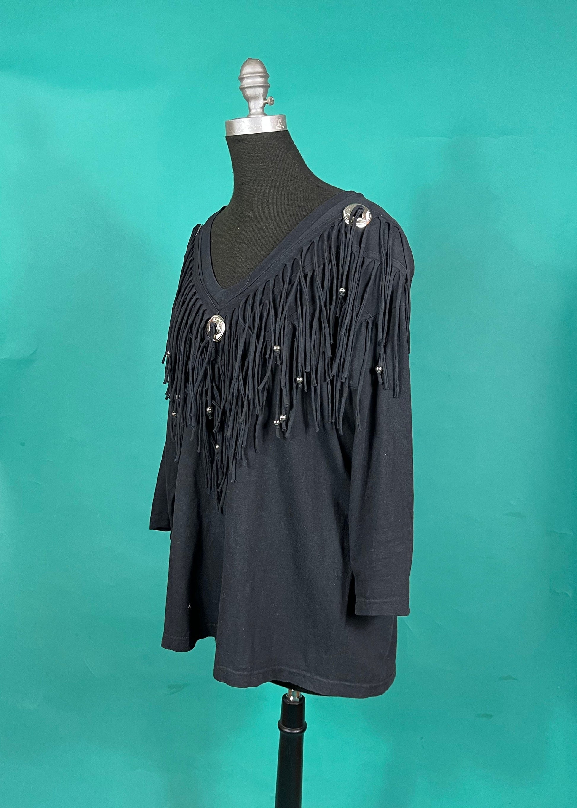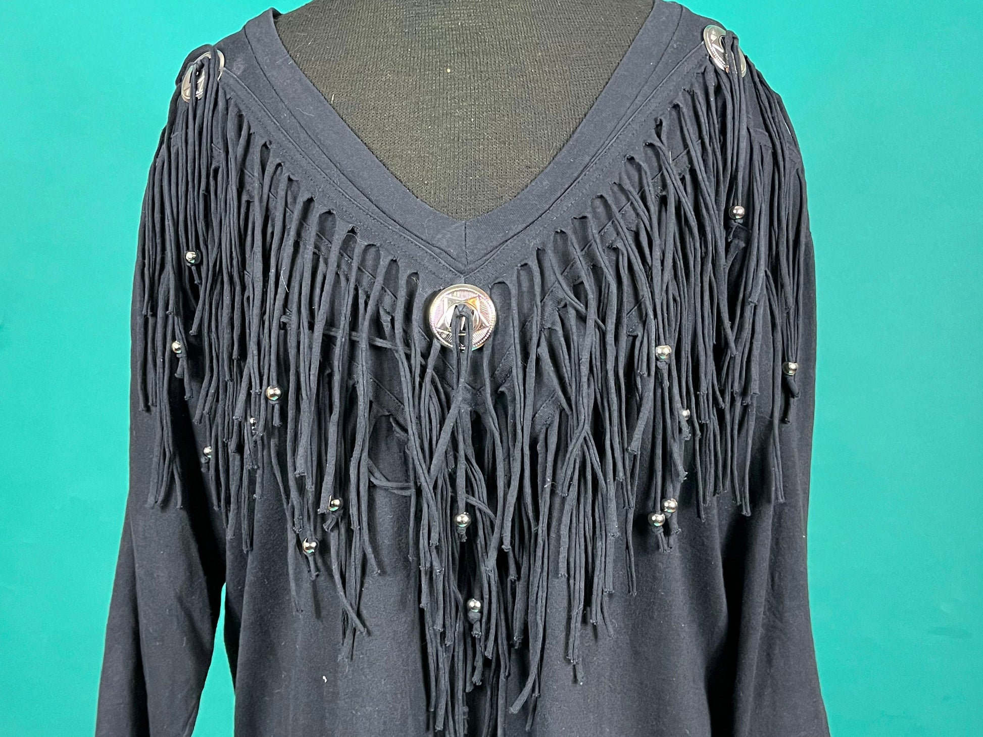 Vintage 90s Concho Black Beaded Tassel Country Western V Neck Batwing Quarter Sleeve Top