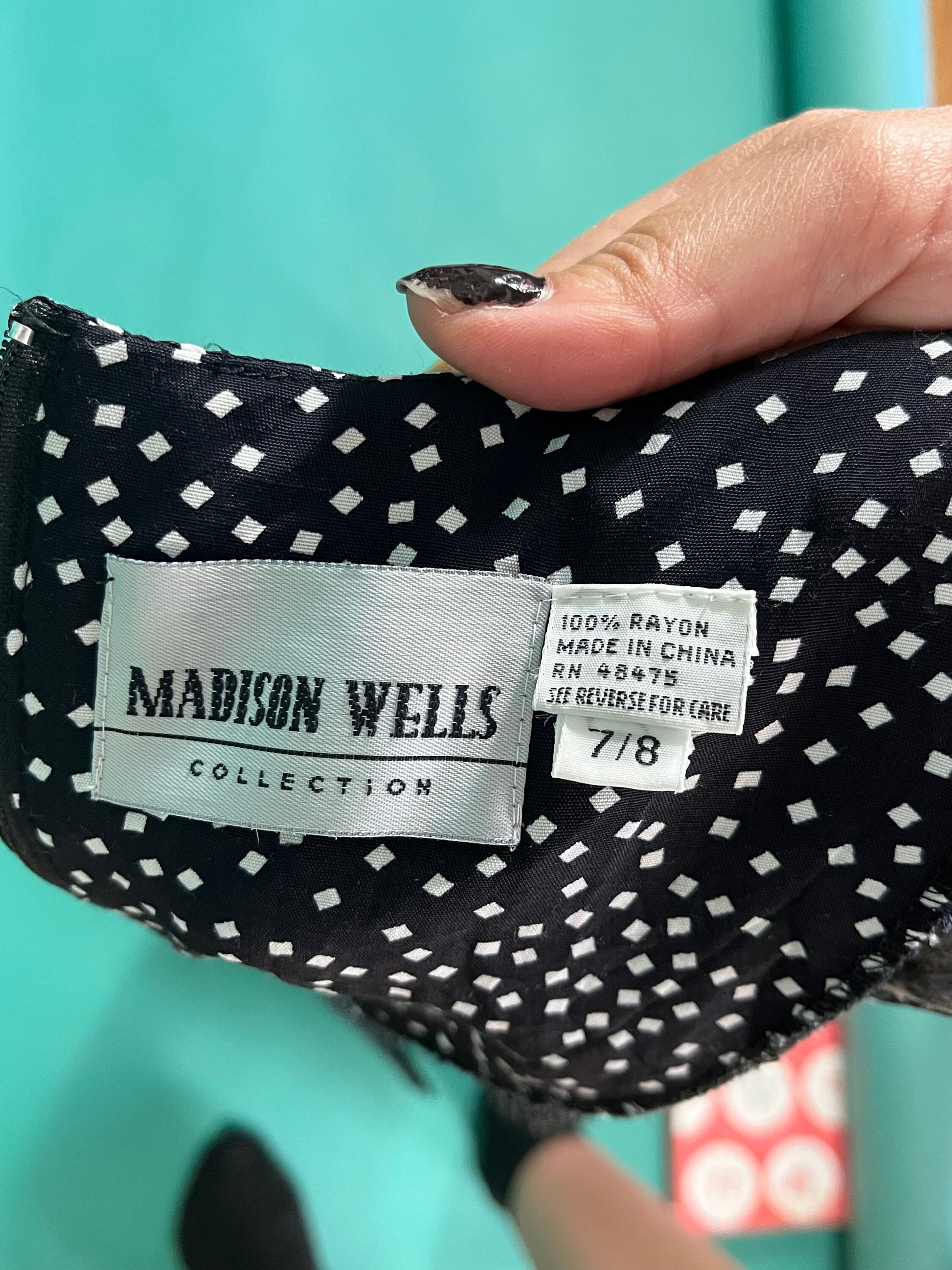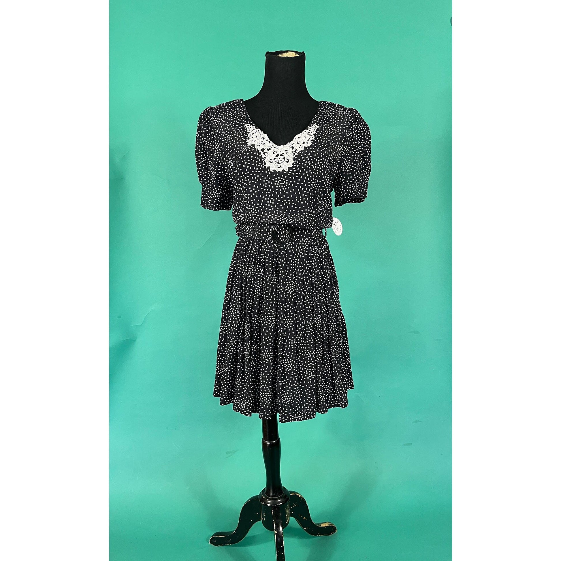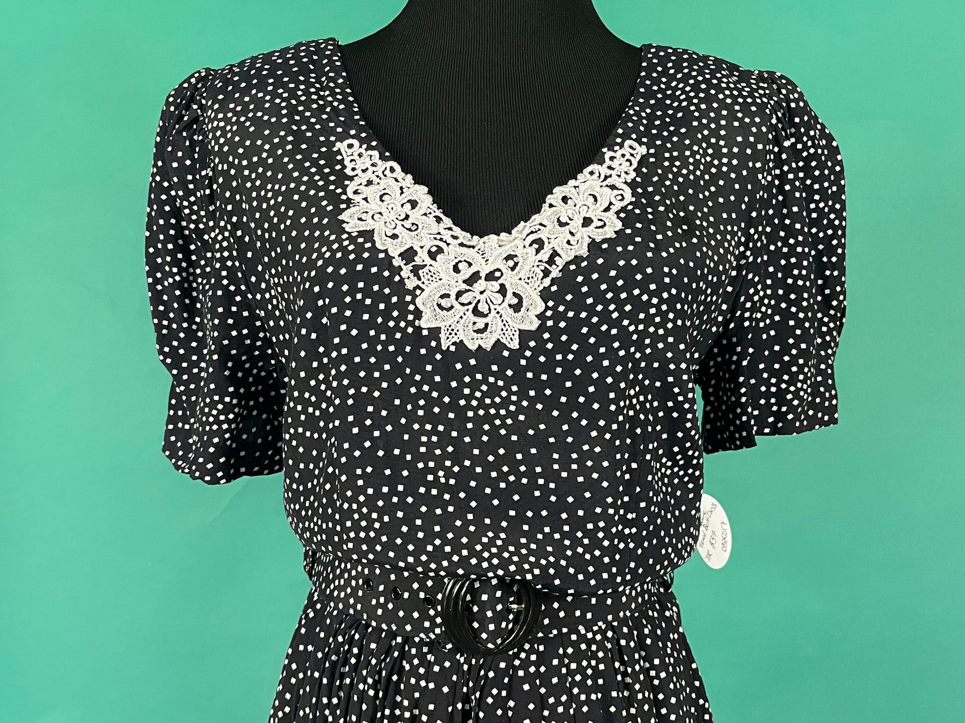 Vintage 90s Lace Applique Square Dot Pleated Skirt Belted Madison Wells Collection Dress size 7 8