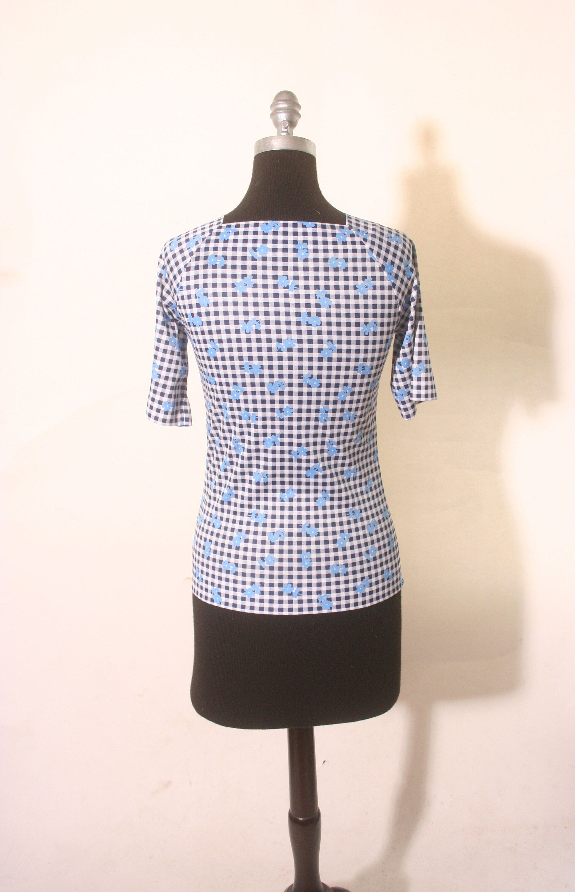 Vintage 90s Quarter Sleeve Blue Picnic Square Neck Fitted Shiny Top size M